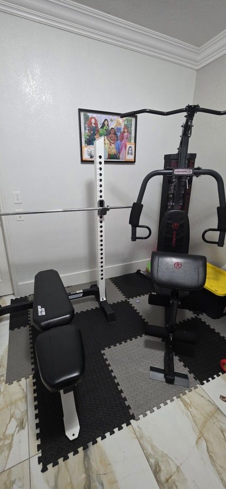Gym equipment in ecelent conditions like new plus accessories and 175 lb in disk of diferents sizes weight. Equipo para hacer ejercicios en exelentes condiciones como nuevo con accesorios y 175 lb en peso discos de diferentes tamanos.