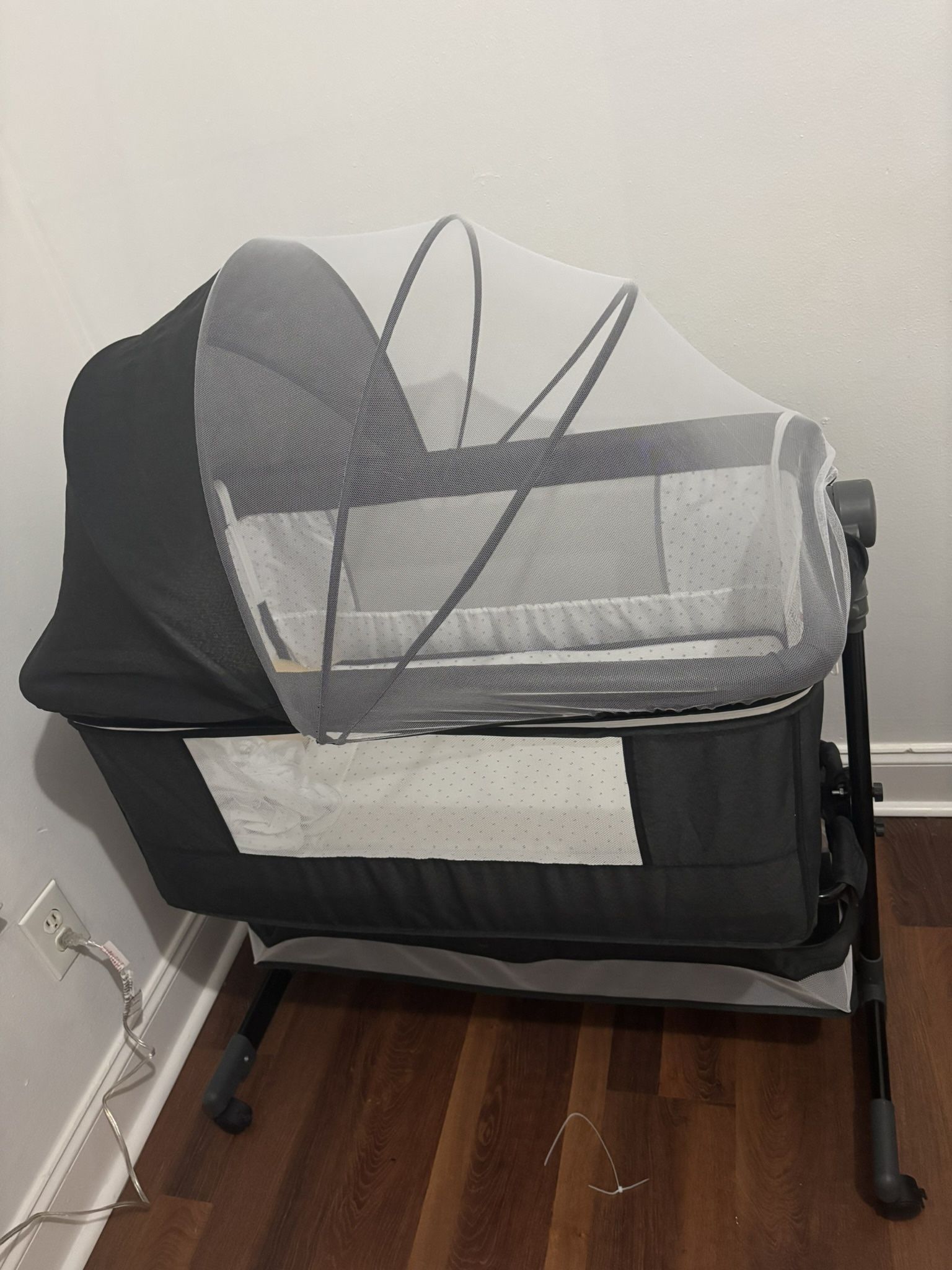 Baby bassinet. Canopy comes off. Firm surface. I suggest buying a foam pad if you want something softer for your baby. If you see it, it’s still available!