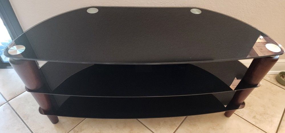 De Cristal negro y patas de madera color miel. 3 niveles. Black shiny glass & mahogany wood legs corner 3-tier table. Width goes from 50" to 25" to accommodate a corner. 2 feet high and 19" deep. Beautiful, like new!
