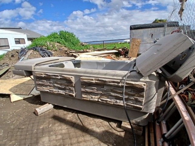 Portable hot tub or swim spa, featuring decorative stone paneling on the exterior. Type: Portable therapeutic spa for relaxation and hydrotherapy. Features: Specialized jet systems for personalized massage experiences. It works great, extremely relaxing! Not wanting to sell, but I need to sell to help pay for my dog's surgery. OBO