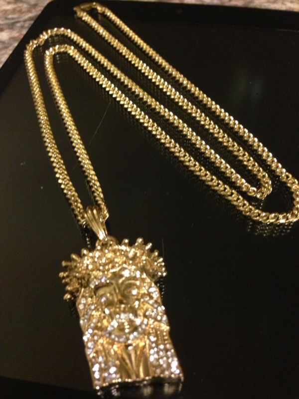 Gold Plated Swarovski Crystal Jesus Pendant With Thin Cuban Link