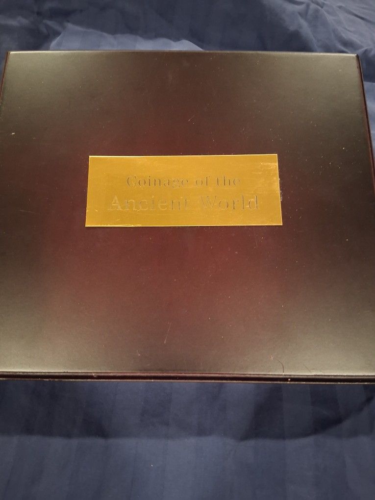 Set of six coins in a box. Judea Prutah, Macedon Drachm, Roman Victoriatus, byzantine Follis, caesarea Drachm and Roman Denarius.