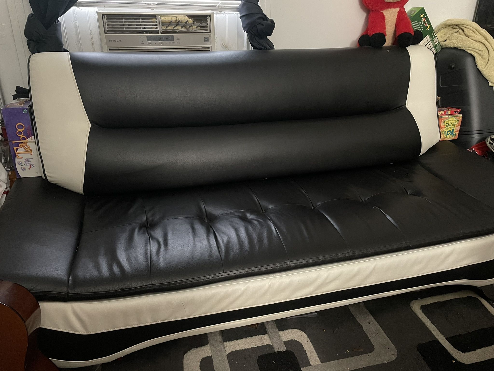 Black and white leather couch Has a small rip on top right Top half comes off of the bottom half for easy transportation Really lightweight couch Good beginner couch, too small for me now