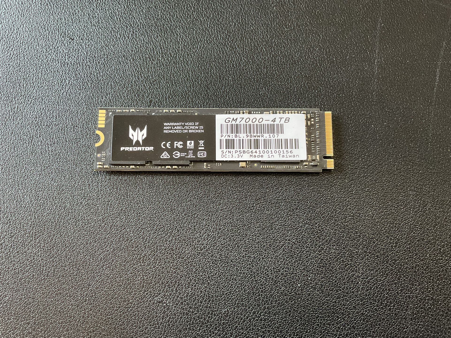 This is an SSD drive I bought for my old PC that is not compatible. Missed the return window so now its up for sale. Full description here: This is $600.00 new, I am asking $425.00. Specs: Predator M.2 SSD 4TB GM7000 with DRAM cache NVMe 1.4 2280 PCIe Gen4×4 Ultra high speed (maximum read: 7400MB/s, max write: 6700MB/s) 3D NAND TLC Internal SSD Compatible with PS5 Pro - BL.9BWWR.107 PCIe Gen4 Standard: The Acer Predator GM7000 M.2 NVMe SSD utilizes the PCIe Gen4 standard to deliver impressive sequential read speeds up to 7400 MB/s and write speeds up to 6700 MB/s, making it an ideal 4TB NVMe SSD for high-performance gaming PCs. Efficient Heat Dissipation: Acer Predator GM7000 NVMe SSD features a customized heat spreader designed to enhance heat dissipation, ensuring lower operating temperatures during heavy use for improved performance and reliability. Less Energy: The GM7000 SSD's advanced controller includes an integrated PMU (Power Management Unit) that optimizes energy efficiency, reducing power consumption and helping your Gaming PC run cooler, last longer, and maintain overall system health for an extended lifespan. Digital Storage Capacity4000 GB Hard Disk InterfaceSolid State Connectivity TechnologyPCIe Additional FeaturesPS5 Compatible Hard Disk Form Factor2.5 Inches Compatible DevicesDesktop, PC, Computer, Laptop, Netbook Specific Uses For ProductGaming Read Speed7400 Megabytes Per Second Media Speed6300 Megabytes Per Second Cache Memory Installed Size4 GB Data Transfer Rate7400 Megabytes Per Second Form FactorM.2 Hardware ConnectivityPCI Express 4.0