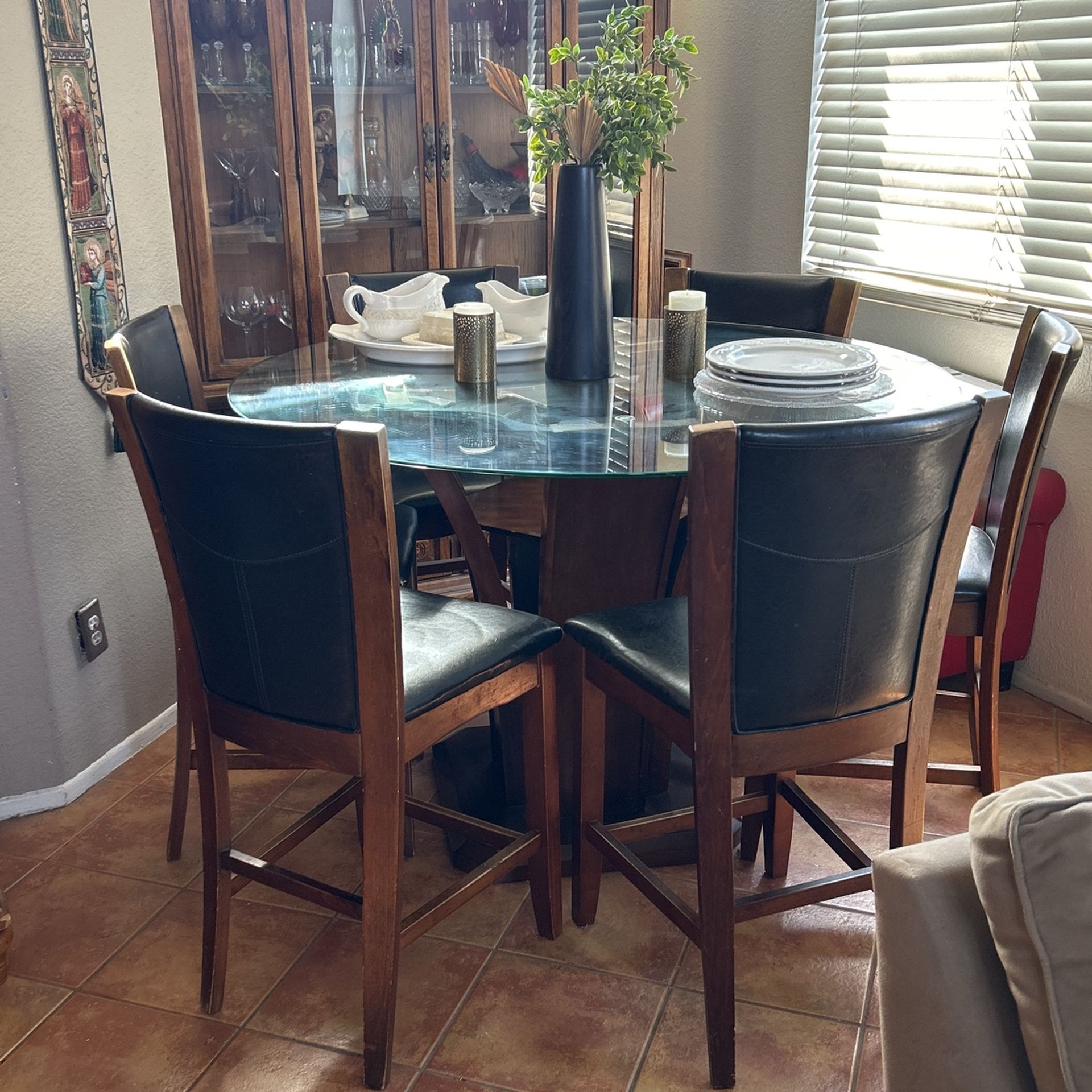 Glass table, top wooden base, six chairs, wooden legs and, black leather seats.. and a sideboard hutch. It’s a two-piece top and bottom glass shelves.