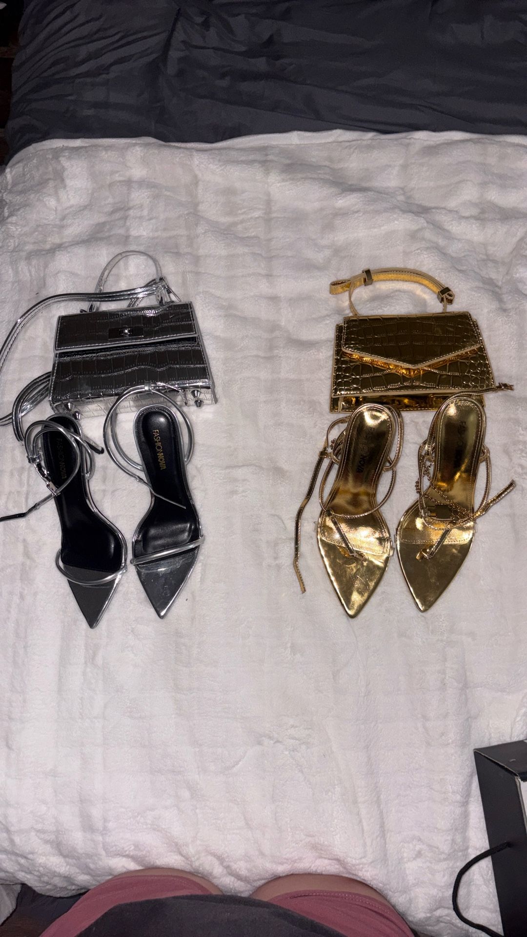 Only worn once … they look brand spanking new … Gold purse and hells $70 silver purse and heels $70 If you want both we can 150 but we can Negotiate a price