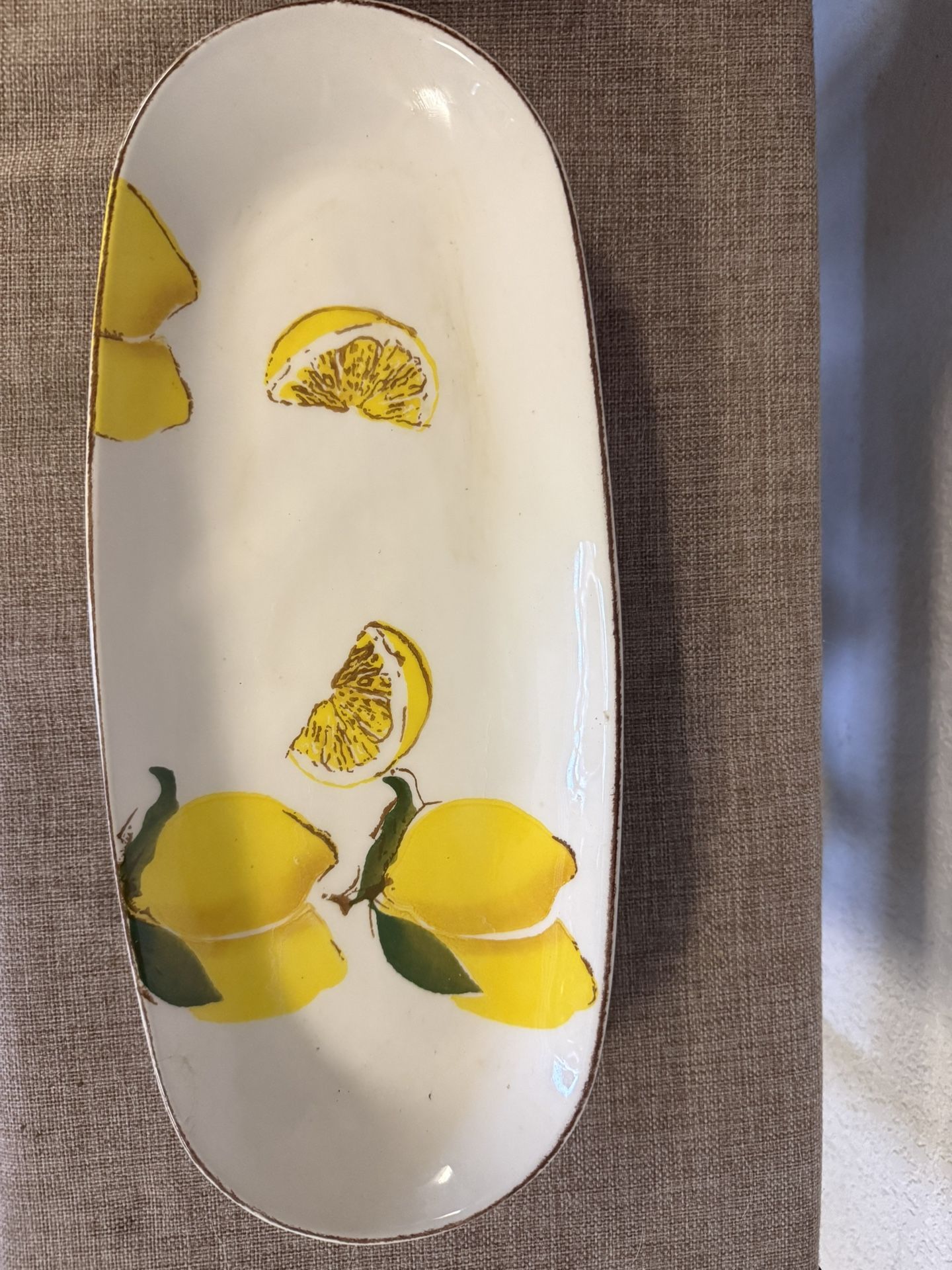 Bright ceramic oval platter. Has a fun lemon design. Great for serving snacks or as a decorative piece. 14 inches long x 6 inches wide