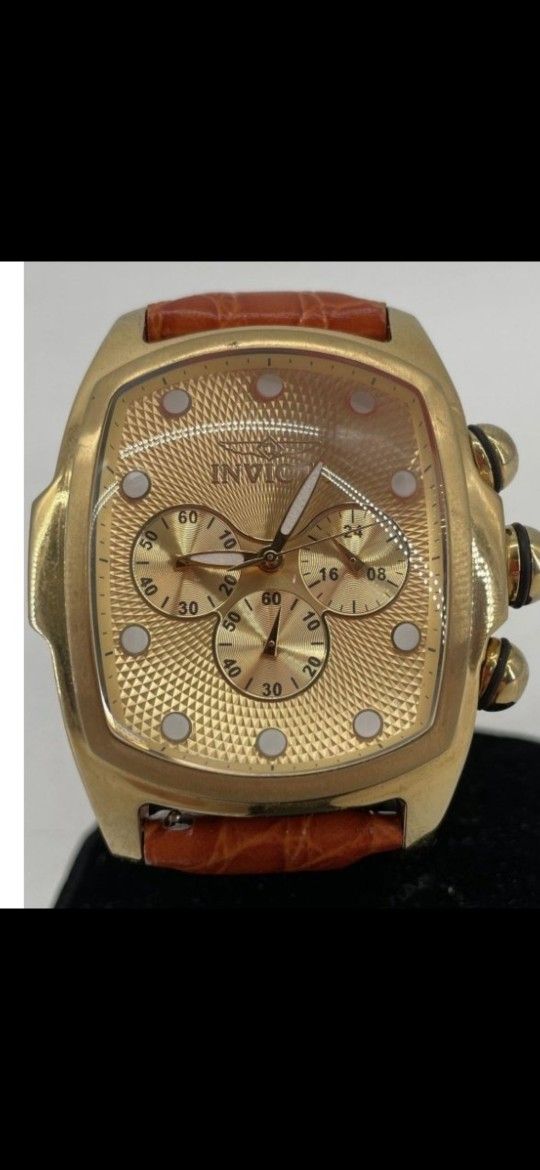 Model: Authentic Invicta Lupah Special/Limited Edition, Model No. 0068. Design: Features the iconic Lupah "tonneau" (barrel-shaped) gold-tone stainless steel case with a sophisticated textured sunray dial. Glass: Equipped with a signature curved "Flame-Fusion" crystal for durability and scratch resistance. Movement: Precision Japanese Chronograph movement with sub-dials for 60-second, 30-minute, and 24-hour displays. Visibility: Features "Tritnite Night Glow" technology for high visibility in low-light conditions. Strap: Includes the original "Genuine Leather" embossed strap in a stylish tan/cognac color with a signed Invicta buckle. Condition: Water-resistant up to 100 feet (30 meters).