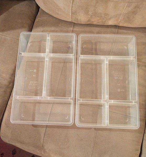 $5 each 2 clear plastic bins for keeping things organized in a drawer. Use for office, bathroom, crafts, etc 13"x8.25"x2.25"