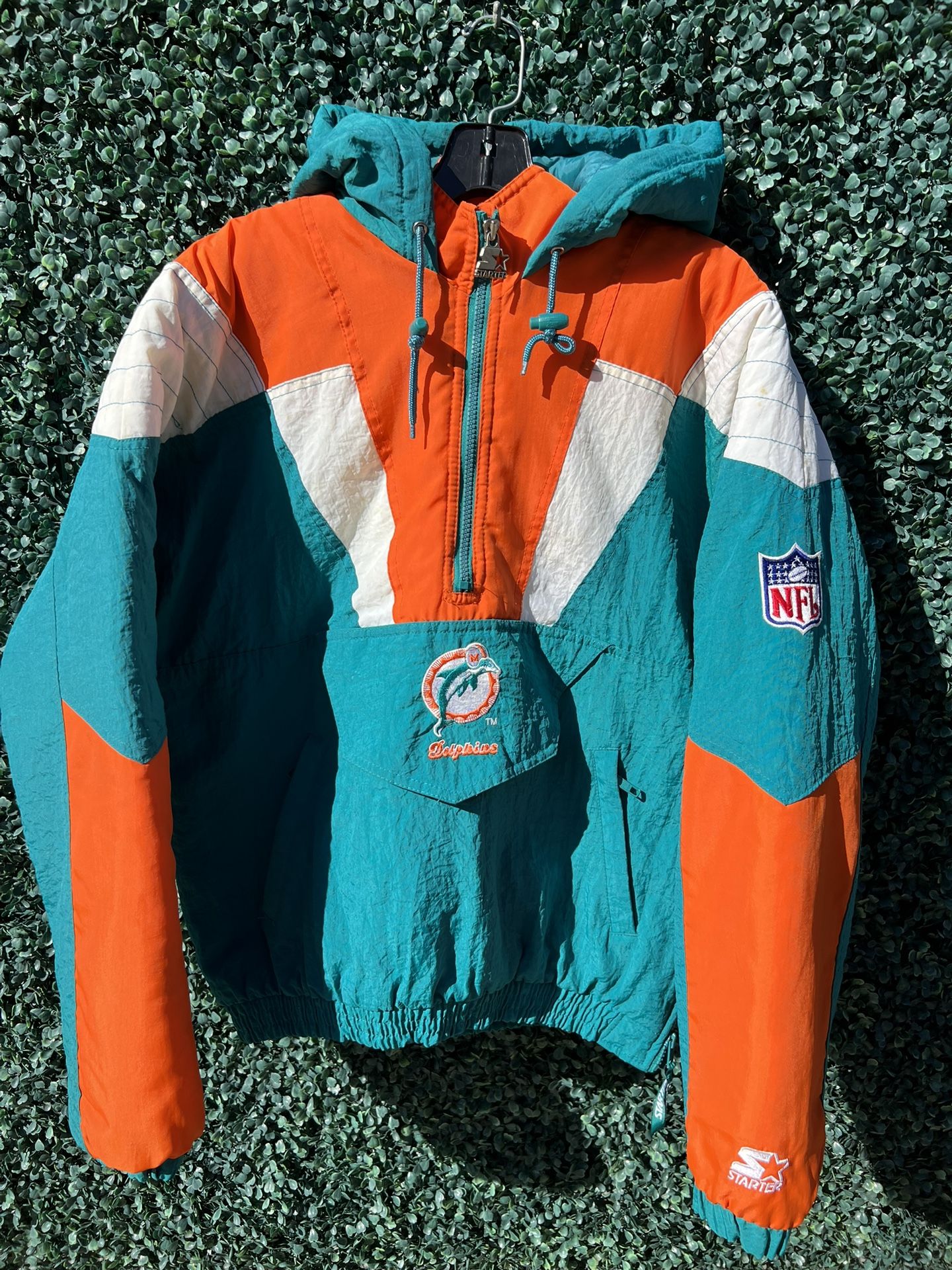 Here we have a vintage Miami Dolphins bomber jacket and good condition starter size small fits like medium large but in good condition