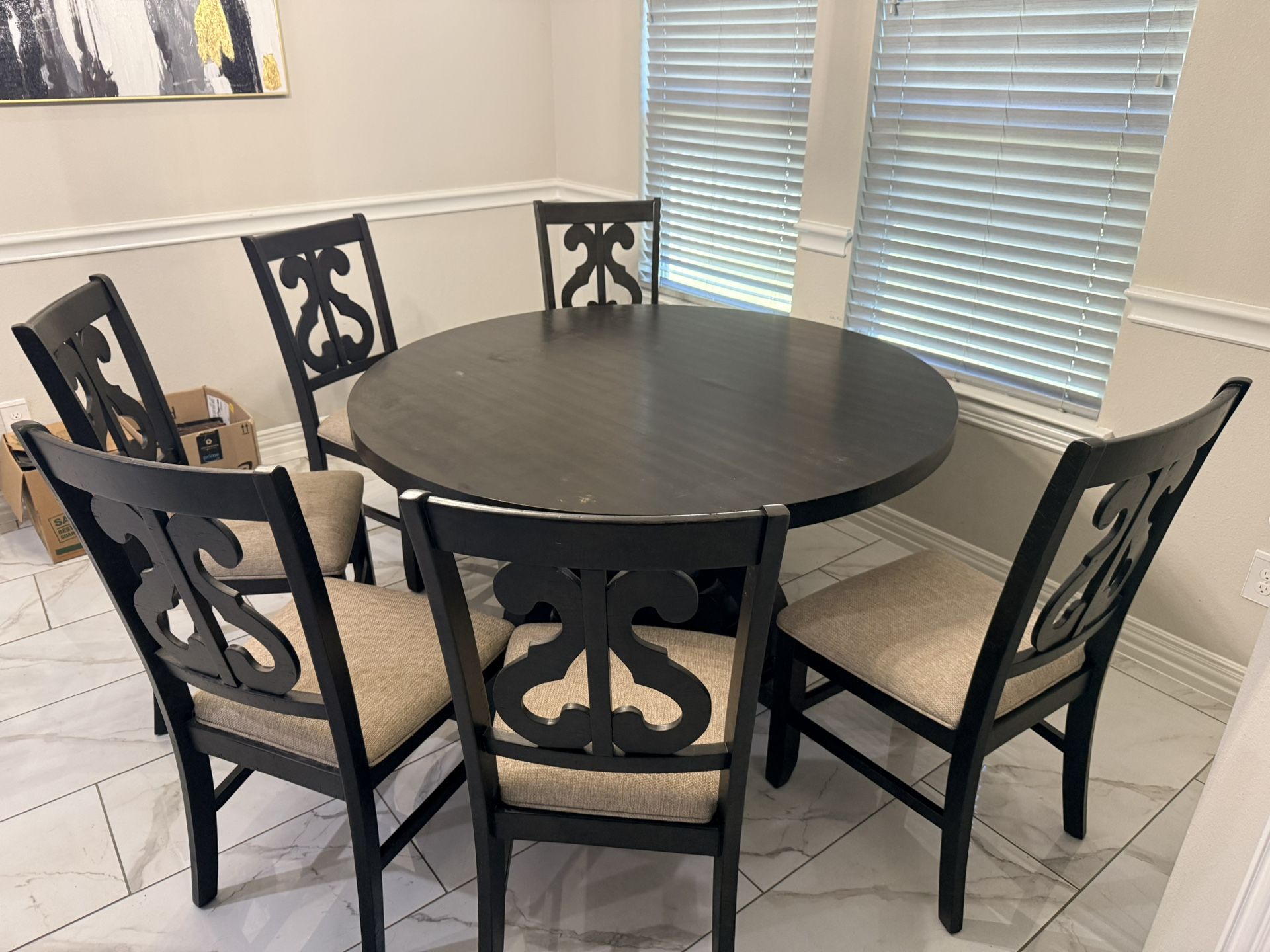 Dining table with 6 chairs, 60” diameter. Pet household. There are imperfections in the table, photos posted.