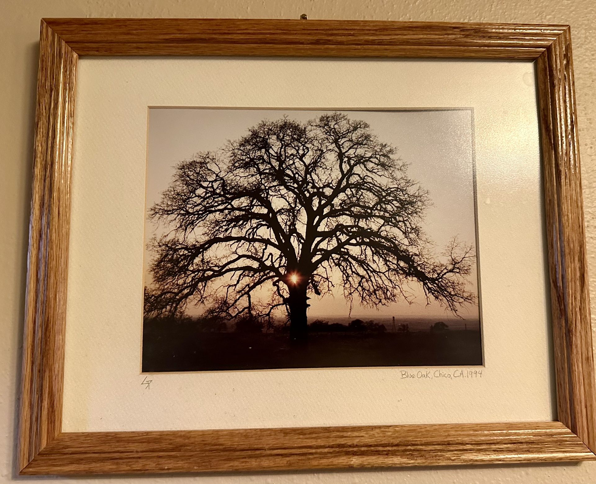The print features a silhouette of an oak tree against a sunrise or sunset, with the sun visible through the center of the branches. The text: "Blue Oak, Chico, CA. 1994". 12.5x16 Point Loma