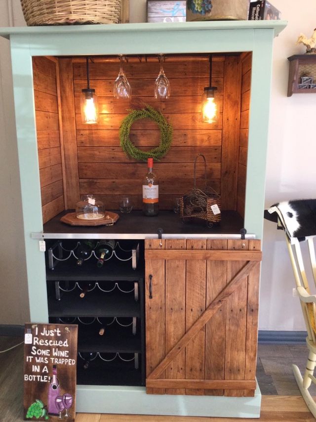 Custom, solid wood w/ sliding barn door with lights! Holds wine glasses at top and bottles of wine in bottom with storage. Absolutely Stunning piece
