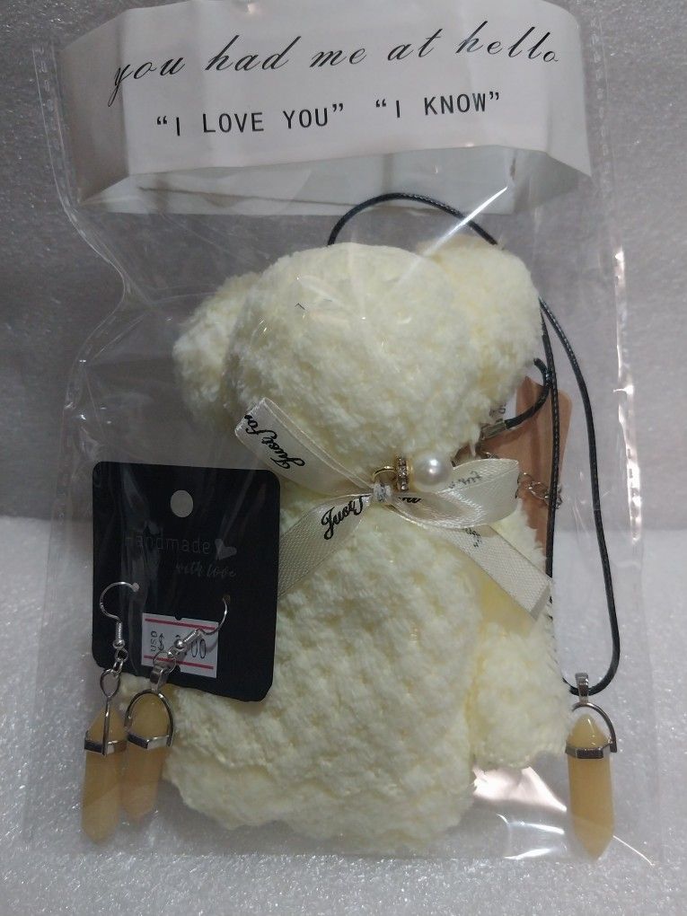 11.8 inch Yellow coralsilk rag tied in the shape of a bear with crystal jewelry set (earrings with .925 plated hooks and matching pendant)