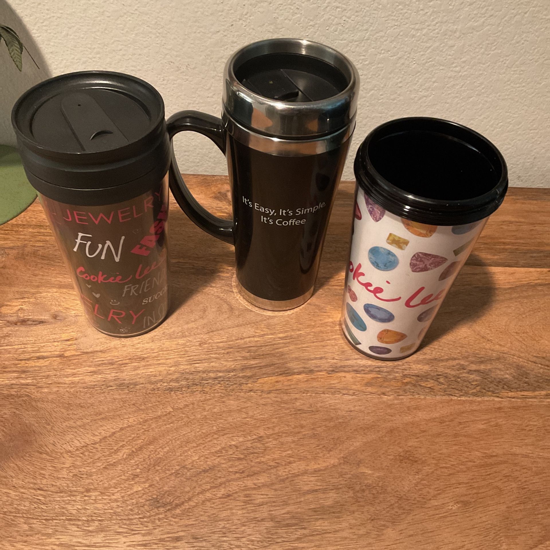 2 Cookie Lee cups, one without the lid 1 Organo Gold with a handle