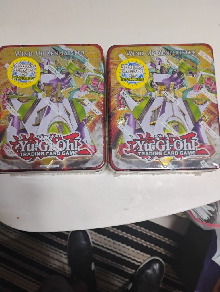 2 sealed tins of YU-GI-OH trading cards wind-up-zenmaister 5 packs 4 foil cards and pot of duality $100 a piece obo