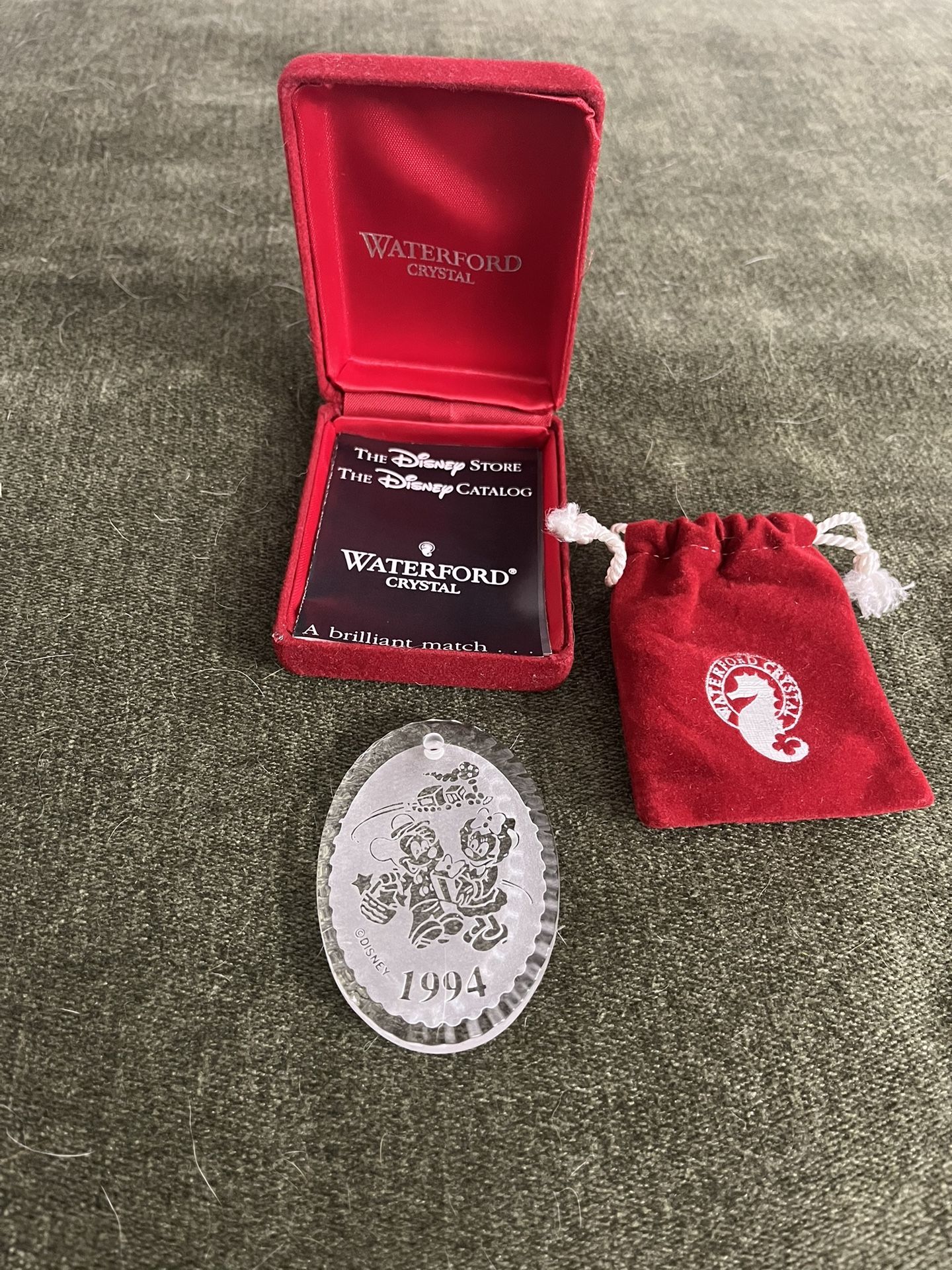 Mickey Mouse and Minnie Mouse Disney World 1994 Waterford Crystal Christmas tree ornament excellent condition. New still in box. Classic Disney memorabilia.