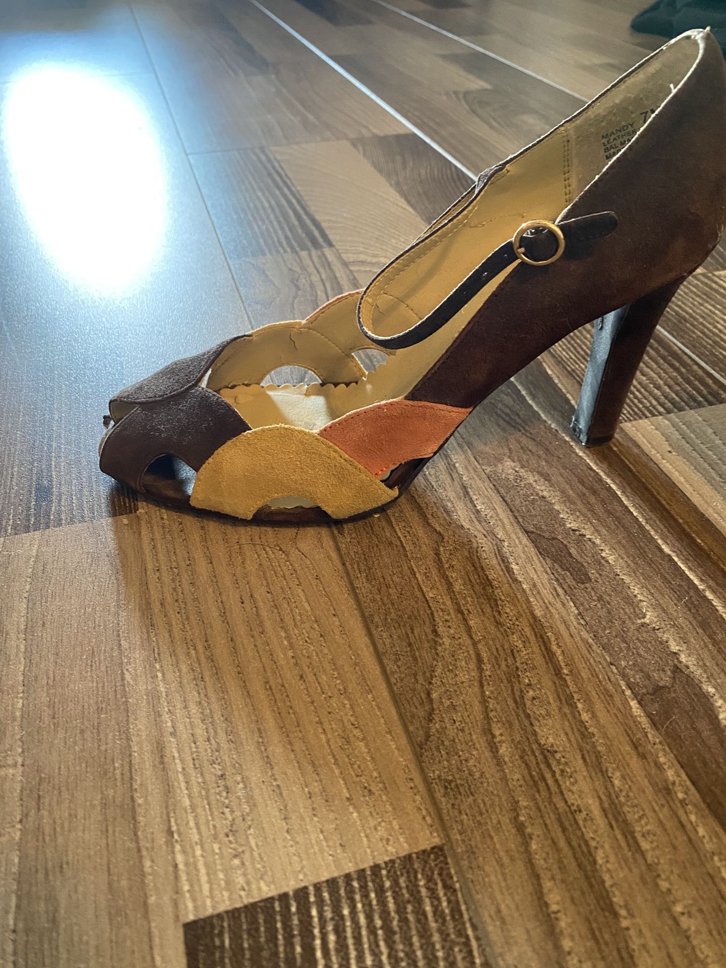 Barely worn, fun Chinese Laundry brown suede heels with yellow suede and coral suede detailing along the sides. 3 1/2 inch heel. Size 7. Originally $150