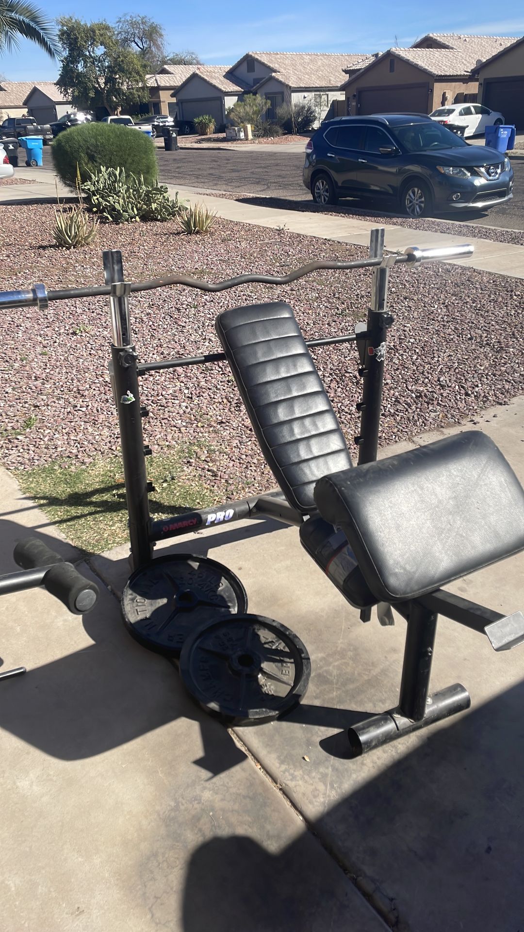 Marcy pro series model bench press lifting set with leg workout extension and arm curl extension for the bench press I’m looking for $240 firm, the weights are two pairs of 45lbs and 1 pair of 44 lbs all together.