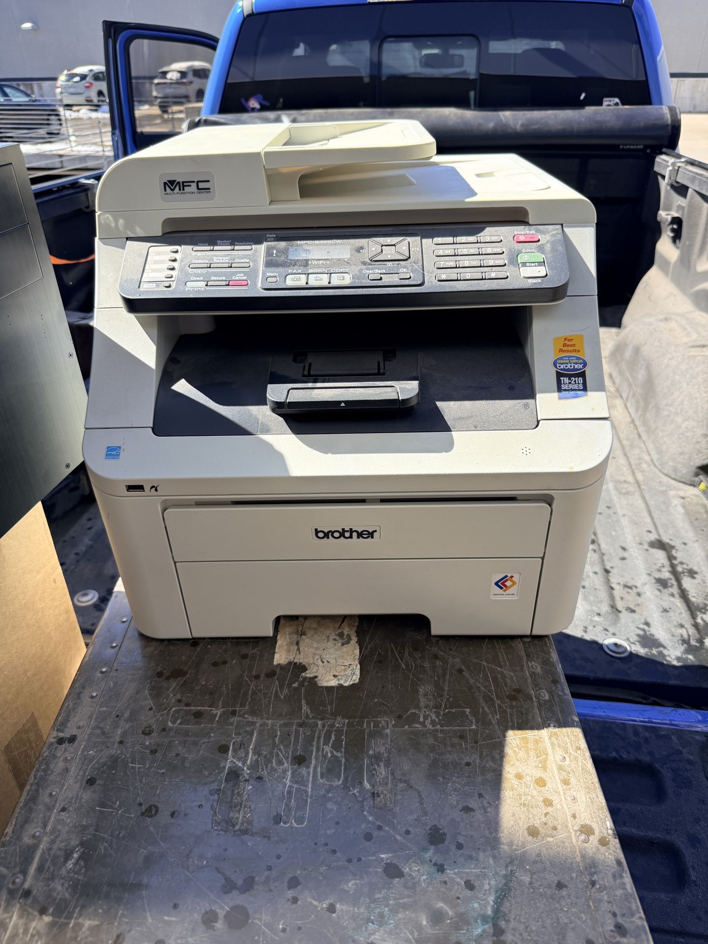 Brother color laser printer. Works well. Has an auto-feed scanner and flatbed scanner. Includes a fax (never used). Can be used wireless. Works with MS Windows, Apple iOS and Mac. This works well. I have two of them. I need to sell one, downsizing where I live.