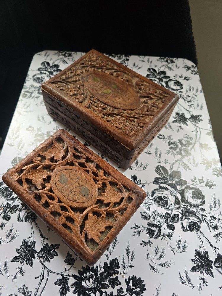 2 boxes. These are about 65 yrs old. They come from the east maybe India. 1 is about 6in the other is about 7in. Felt inside. Floral carvings.