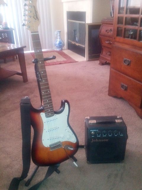 JCX STARGAZER Electric Guitar. Johnson Amp Model: Standard 10. Headphone port in back. One string broken, but also comes w/ replacement strings.