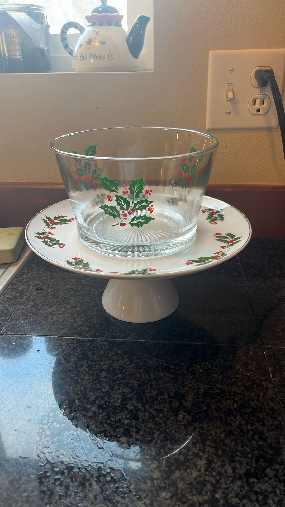 Nice Christmas serving set. No flaws that I can see. Includes cake stand, salad or punch bowl, sugar dish and cream pitcher.