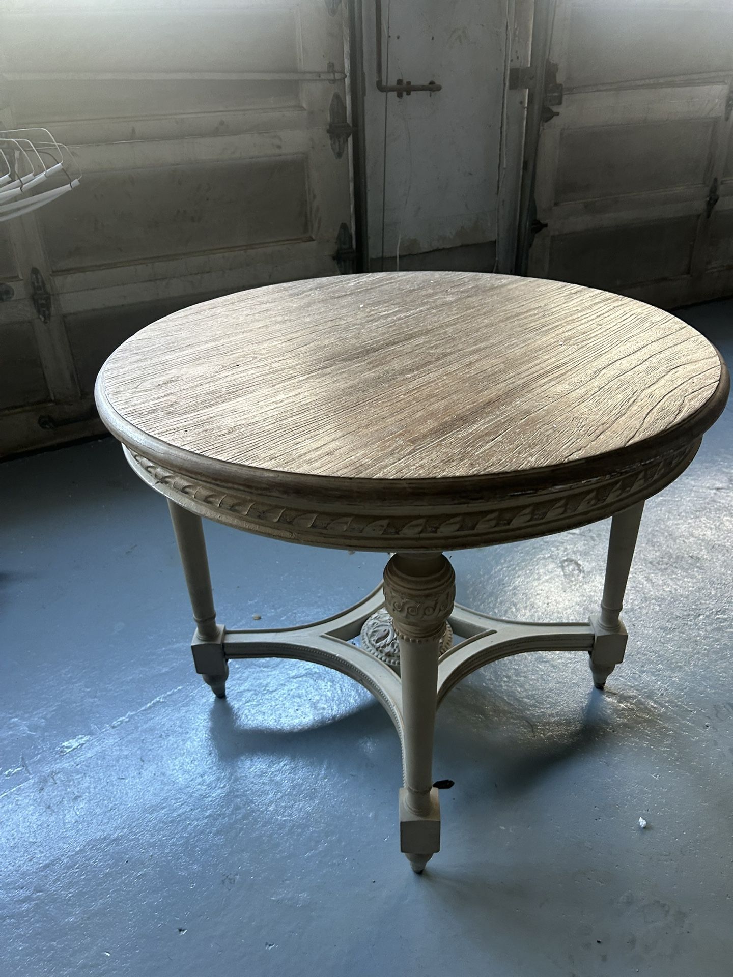 Nice wood table with farmhouse finish and carvings. Can send measurements on request.