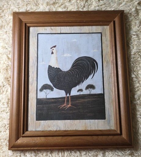 Vintage American Folk Art Style Farmhouse Decor 11x13 Add a touch of rustic country charm to any space with this classic framed print. This piece depicts a charming black and white rooster in a simple, natural landscape. It is an ideal addition to farmhouse, rustic, or cottage-inspired kitchens, living rooms, or dining areas. Style: American Folk Art, Primitive, Country Colors: Black and white rooster against a light blue/neutral background Frame: Wood frame in a natural or light brown finish (as pictured) Approximate Dimensions: 11 inches x 13 inches (frame size) Condition: Gently used vintage condition. Frame is solid with minor wear, perfect for a rustic aesthetic. $5 #19-26