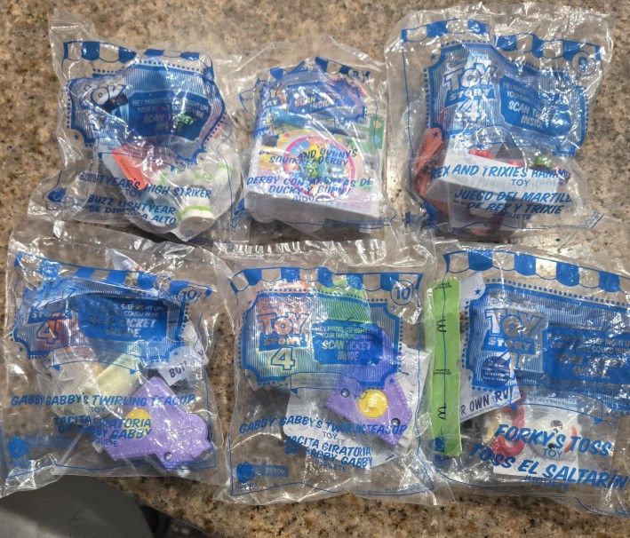 I have 6 sealed happy meal toys from toy Story 4 there are 2 Gabby, buzz,forky,ducky and bunny,Rex and Trixie hammer time