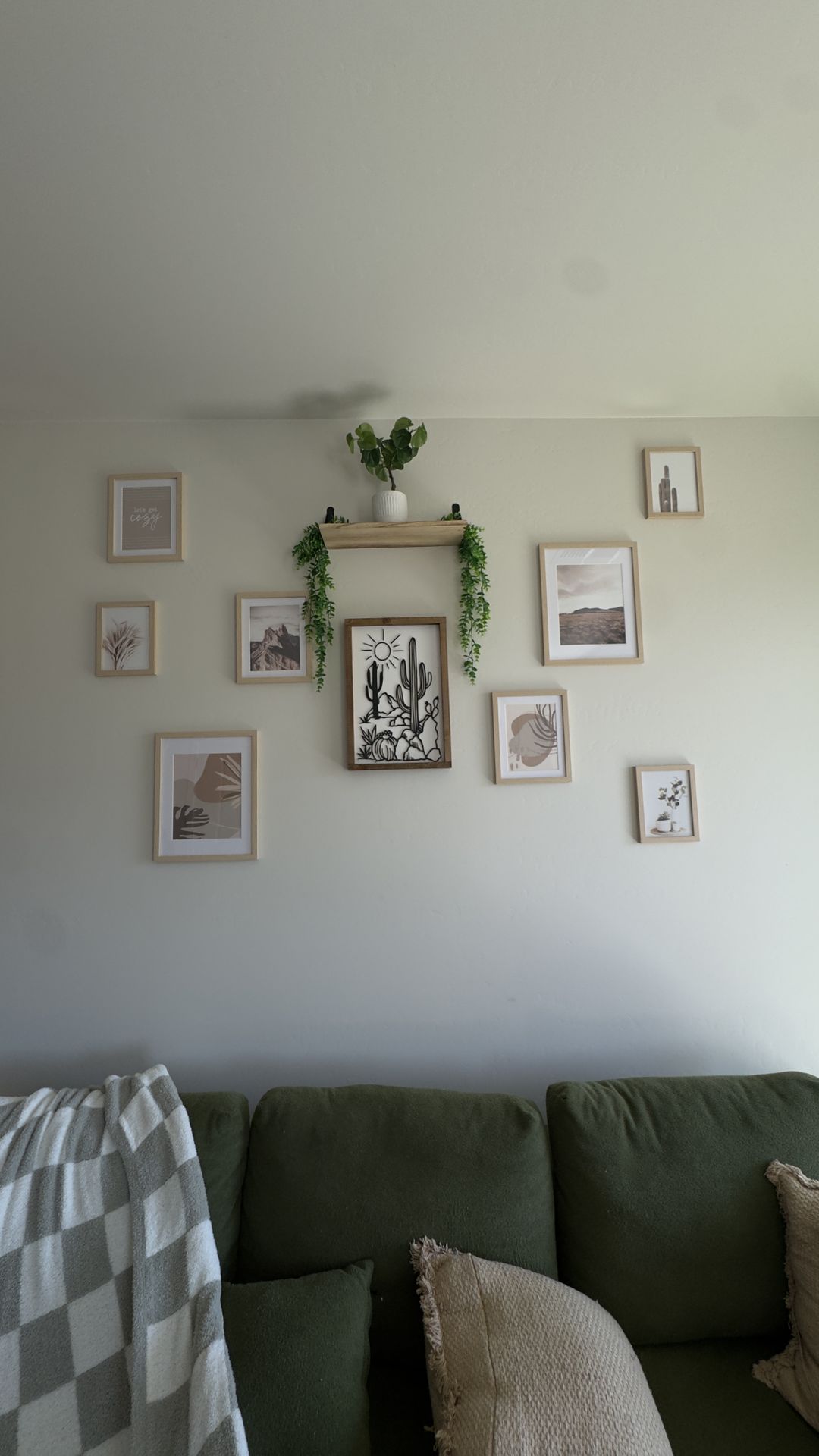 Boho desert themed wall art set with 9 framed pieces total. Includes: • 8 light wood frames with neutral desert/boho artwork • 1 darker wood frame in the center featuring an Arizona desert landscape Perfect for a gallery wall, living room, bedroom, or apartment decor. Neutral tones make it easy to match with many styles. (Pictures in light wood frames can be removed) Shelf and plants are NOT included. Frames and artwork only. 📍 Pickup only - North Phoenix by 303 & 17 Dimensions: Mixed frame sizes (see photo for layout reference). Availability: If the post is up, it’s available.