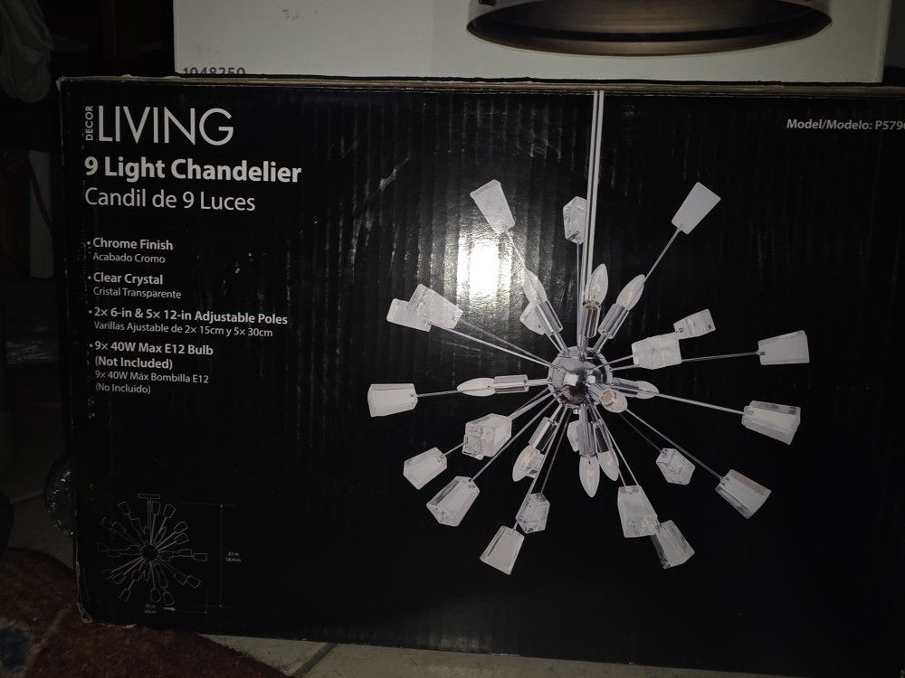 9 light chandelier/ candil de 9 luces •Chrome Finish / Acabado Cromo •Clear Crystal Cristal / Transparente •2x6-in & 5x12-in Adjustable / Poles Varillas Ajustablede2x 15cmy5x30cm 9x 40W MaxE12 Bulb (Not Included) / 9x40W MáxBombilla E12 (No Incluido)