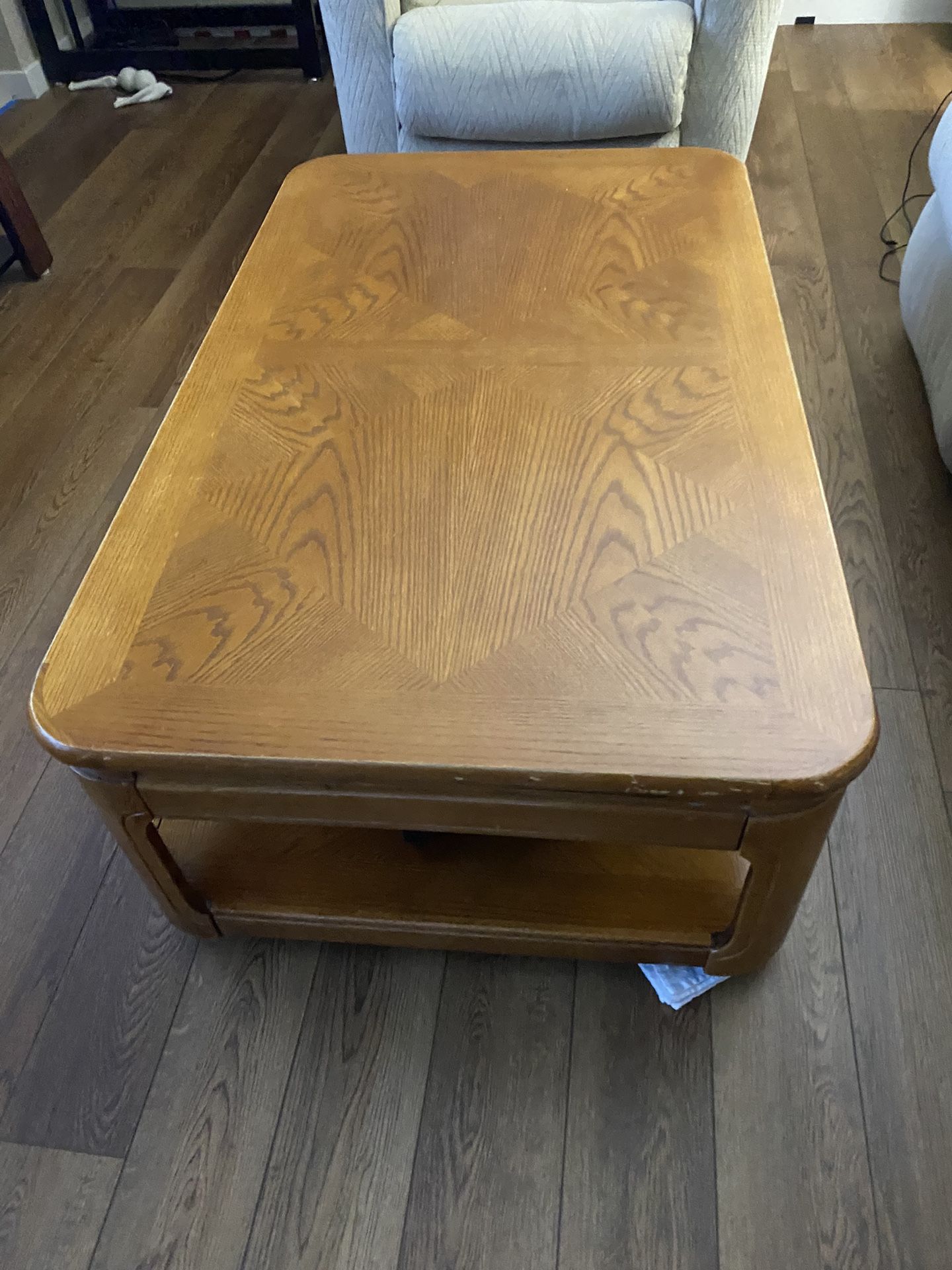 Oak coffee table with moveable wheels in good condition. It’s approx. 49 3/4” long, 29.5 wide, and 17” tall. It was purchased from Art Van. Selling because it does not match our decor. Normal wear on the table but still in great condition! Smoke/Pet free home!