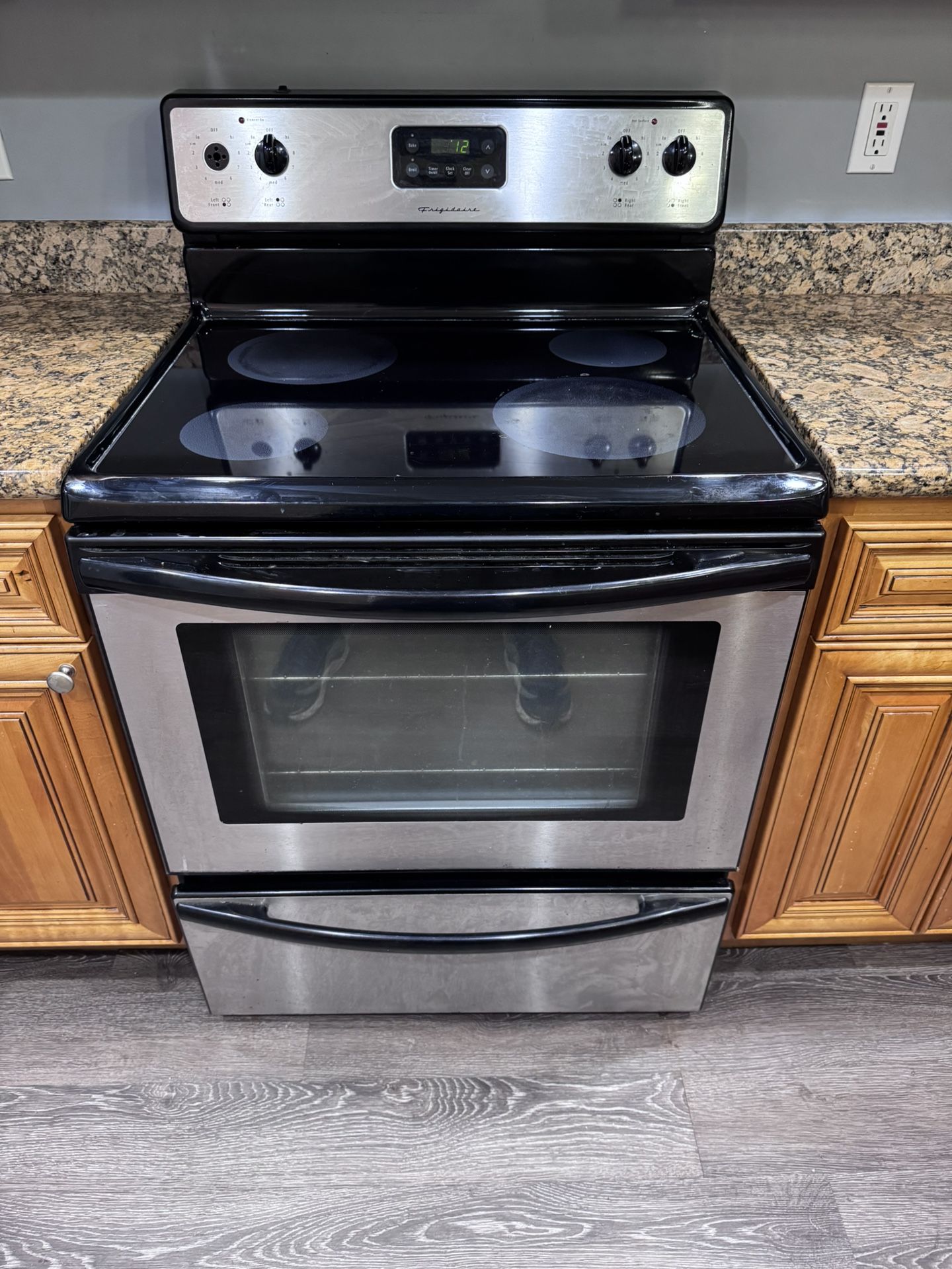 30 inch wide Frigidaire stove. Approximately 45 inches at its highest in the back and approximately 28 inches at its deepest to the front handles. Oven light works but there is no bulb there. Oven and burners work. However small front left burner has no knob so unable to turn this one on.
