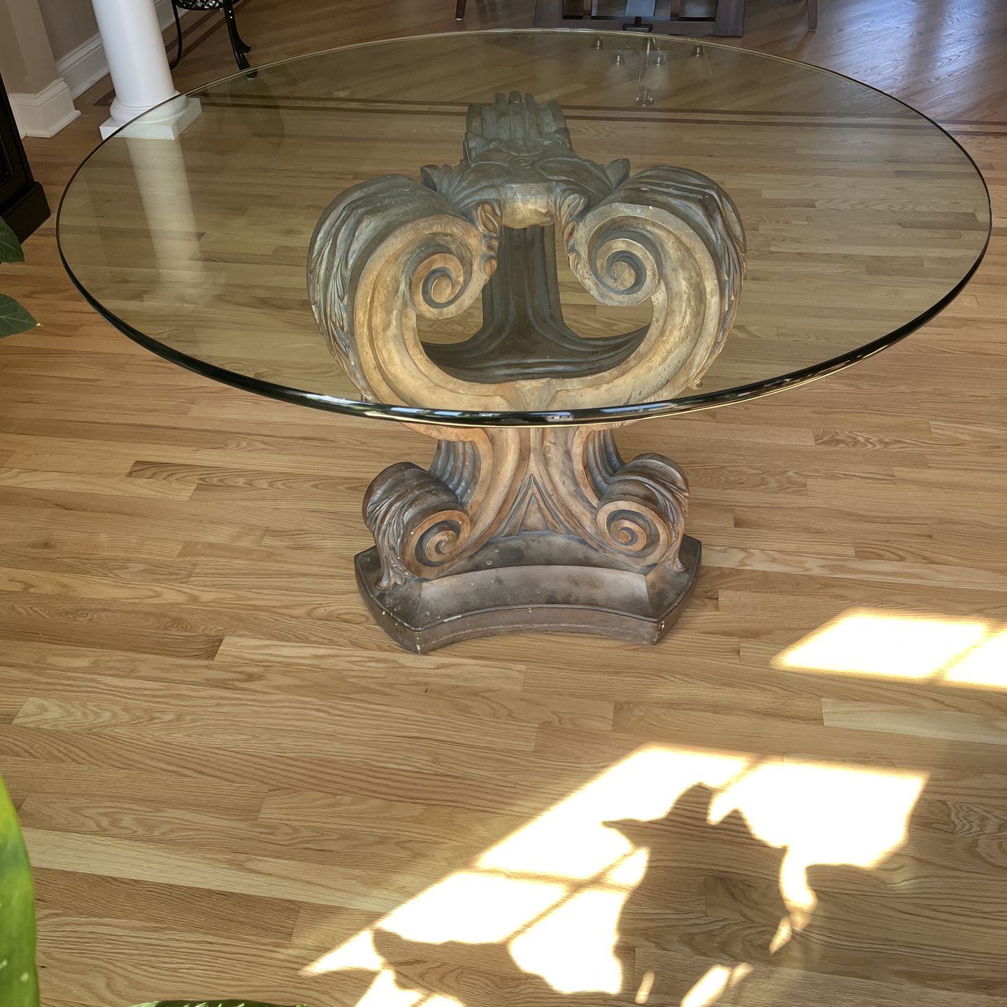 Unique base glass top dining table. Base could be painted to match your design concept. Heavy 1 inc. thick X 48 inch round glass top no damage. Slight damage to base. See picture. Base is hollow.