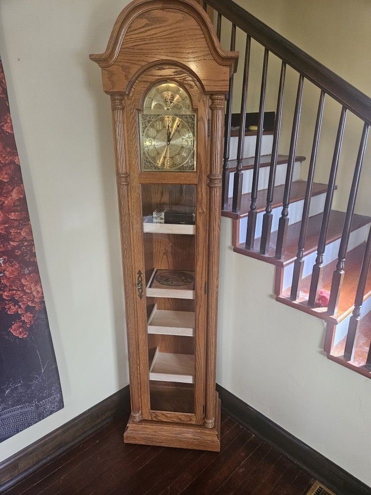 Grandfather clock turned humidor. 4 shelves with side to hold loose cigars or full boxes as shown. 8 3/4 inch deep - 9 1/2 wide - 1 1/2 deep. The clock is 81 inch tall - 18 inch wide - 10 inch deep. Hidden compartment behind the clock face for cutter and lighters and whatever else. Comes with digit hygrometer. Located in Burlington. Cash upon pick up or can be delivered for a small fee.