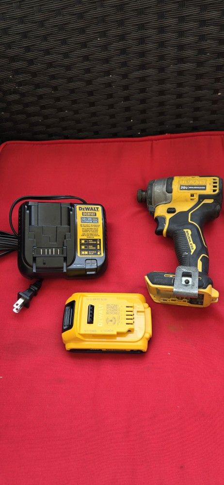 The new battery and charger is used in good condition. El cargador y batería nuevos y el taladro usado en buenas condiciones DEWALT Atomic 20V Max Lithium-Ion Brushless Cordless Compact 1/4 in. Impact Driver Kit with 2.0Ah Battery and Charger