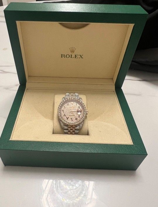 EVERYTHING IS Original Rolex Parts Besides *Custom Aftermarket Diamond Bezel and Dial* comes with original Rolex box no papers. Original: Rolex Movement, Rolex Jubilee Two Tone Rose Gold Band, Rolex Case, Rolex Sapphire Crystal, Rolex Crown on side of watch, Aftermarket; Diamond Bezel + Dial Everything is Natural Diamonds