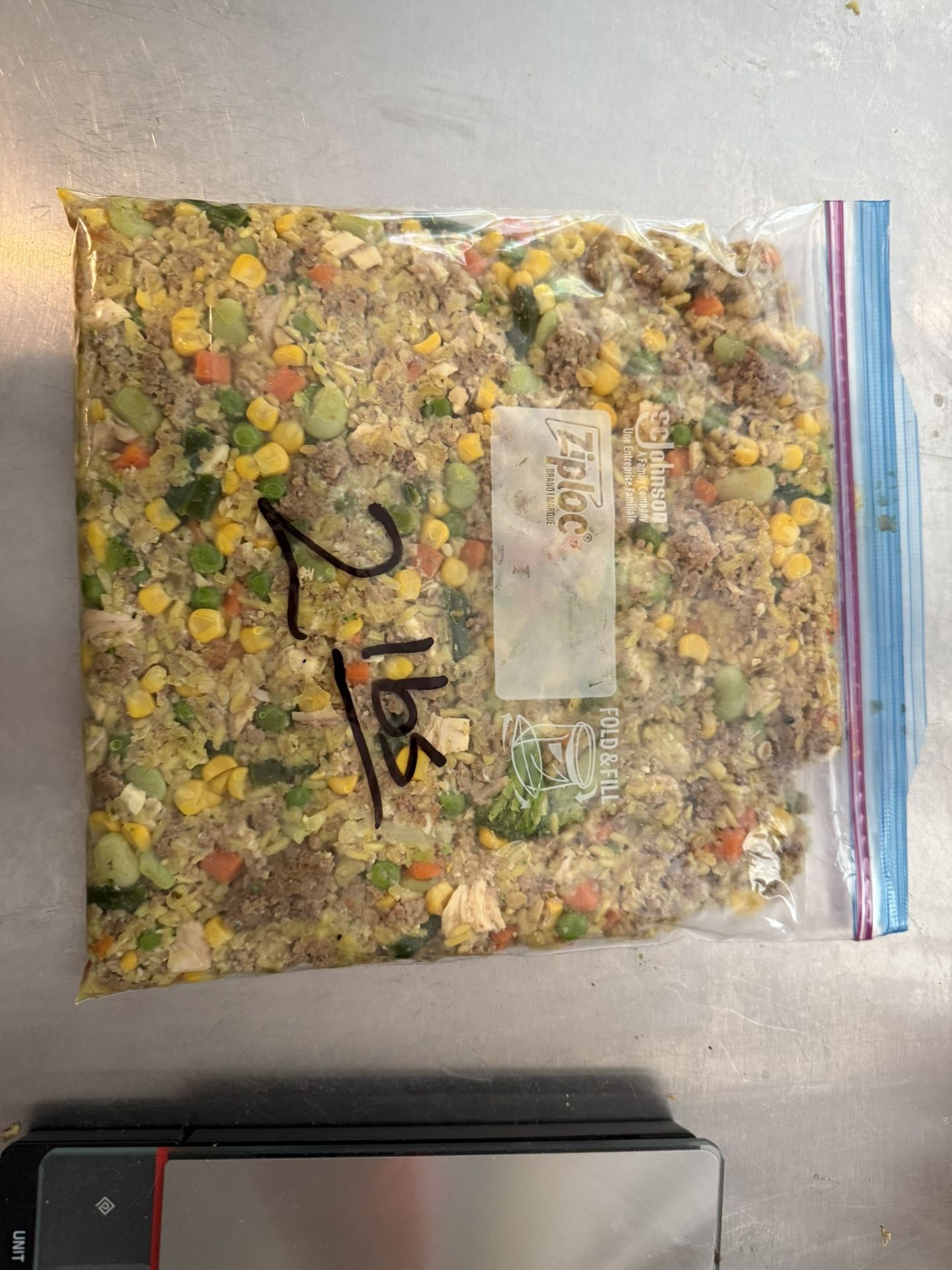 Homemade dog food Contains beef, chicken, rice, oats, carrots, peas, broccoli, cauliflower, Lima beans, green beans, coconut oil, turmeric, ginger, black pepper. All fresh and natural for your dog and healthy for them.