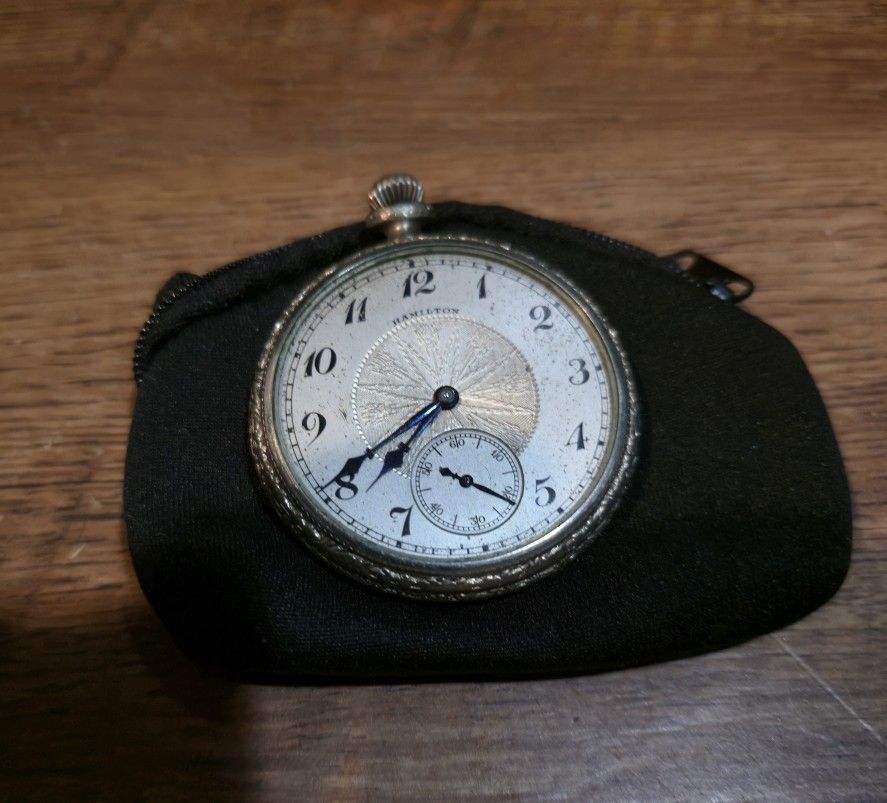 For Sale: Vintage 1925 Hamilton Pocket Watch – Beautiful Condition! Up for grabs is a genuine 1925 Hamilton open-face pocket watch in excellent, honest vintage condition. This is a classic American-made railroad-grade timepiece with the iconic Hamilton branding and that gorgeous engine-turned guilloché dial that catches the light beautifully. Details from the dial: - Signed “Hamilton” at 12 o’clock - Bold Arabic numerals with a classic railway track minute chapter - Blued spade hands in excellent shape - Sunburst guilloché center that radiates from the cannon pinion - Subsidiary seconds dial at 6 o’clock - Original crown and bow The nickel/chromium case (Hamilton’s “Model A” style) shows typical light carry wear and honest patina but no major dings or dents – exactly what you want on a nearly 100-year-old piece that’s actually been used and loved. Crystal is clean with only minor surface marks. Currently running strong and keeping good time, though like any vintage piece it may benefit from a service if you plan to carry it daily. Perfect for collectors, daily carry with a waistcoat, or as a stunning display piece. Comes with a soft black protective pouch as shown. $500 or best reasonable offer. Serious inquiries only – this is a real 1920s Hamilton, not a reproduction. Local pickup in Hampton Roads area or I can ship it to you. Feel free to message with any questions!