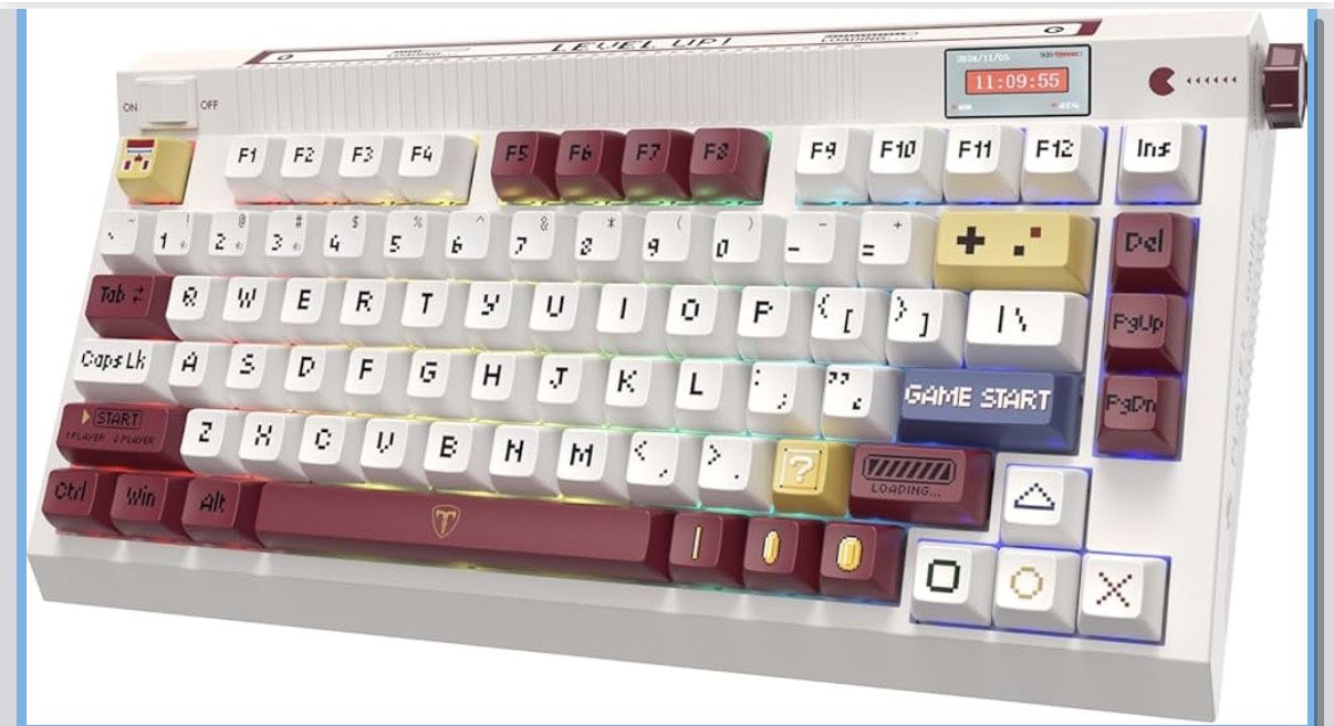 RisoPhy PC423 Wireless Creamy Keyboard with Screen & Knob, 75% 2.4G/Bluetooth/USB-C Gasket RGB Mechanical Keyboard, Hot Swappable, Five-Layer Padding & Pre-lubed Linear Switch, Retro Red and White Retails for over $50. New in box. Big Features on a Small Screen: Our built-in smart display allows you to customize GIFs, display the date, switch between WIN/MAC layouts, check battery status, and more. The intuitive rotary knob lets you effortlessly control volume, connection mode, backlight brightness/speed, and RGB mode/color with a simple twist or click. Retro Typewriter Theme Aesthetic Keyboard: This wireless creamy keyboard embraces a classic retro gaming theme, featuring high-quality PBT keycaps with MDA profile and full-key thermal sublimation.The design pays homage to the golden era of gaming in the 80s and 90s. Triple-mode connectivity: Seamlessly switch between Bluetooth, wired, and 2.4GHz connections to adapt to any device or environment. The dedicated button on the top-left corner allows for instant wired/wireless mode switching. 75% Gasket Mounted Mechanical Keyboard: Our 75% gasket-mounted mechanical keyboard features five layers of sound dampening, reducing noise and providing a smooth, satisfying typing experience. The creamy switches offer a tactile and linear feel, while the hot-swappable design lets you customize to your preference. All-day battery life: Powered by a 6000mAh battery, enjoy up to 400 hours of continuous use (with backlight off) or 600 days in standby mode. Say goodbye to battery anxiety and experience uninterrupted wireless typing. Full Customization: Personalize your gaming keyboard with custom RGB lighting, macros, and animated GIFs using our dedicated software. The OLED screen and rotary knob provide easy access to customization options. Vibrant RGB Lighting: Choose from 18 preset lighting patterns and 8 backlight colors to create the perfect ambiance for any occasion. Easily switch between effects using the OLED screen and shortcuts.