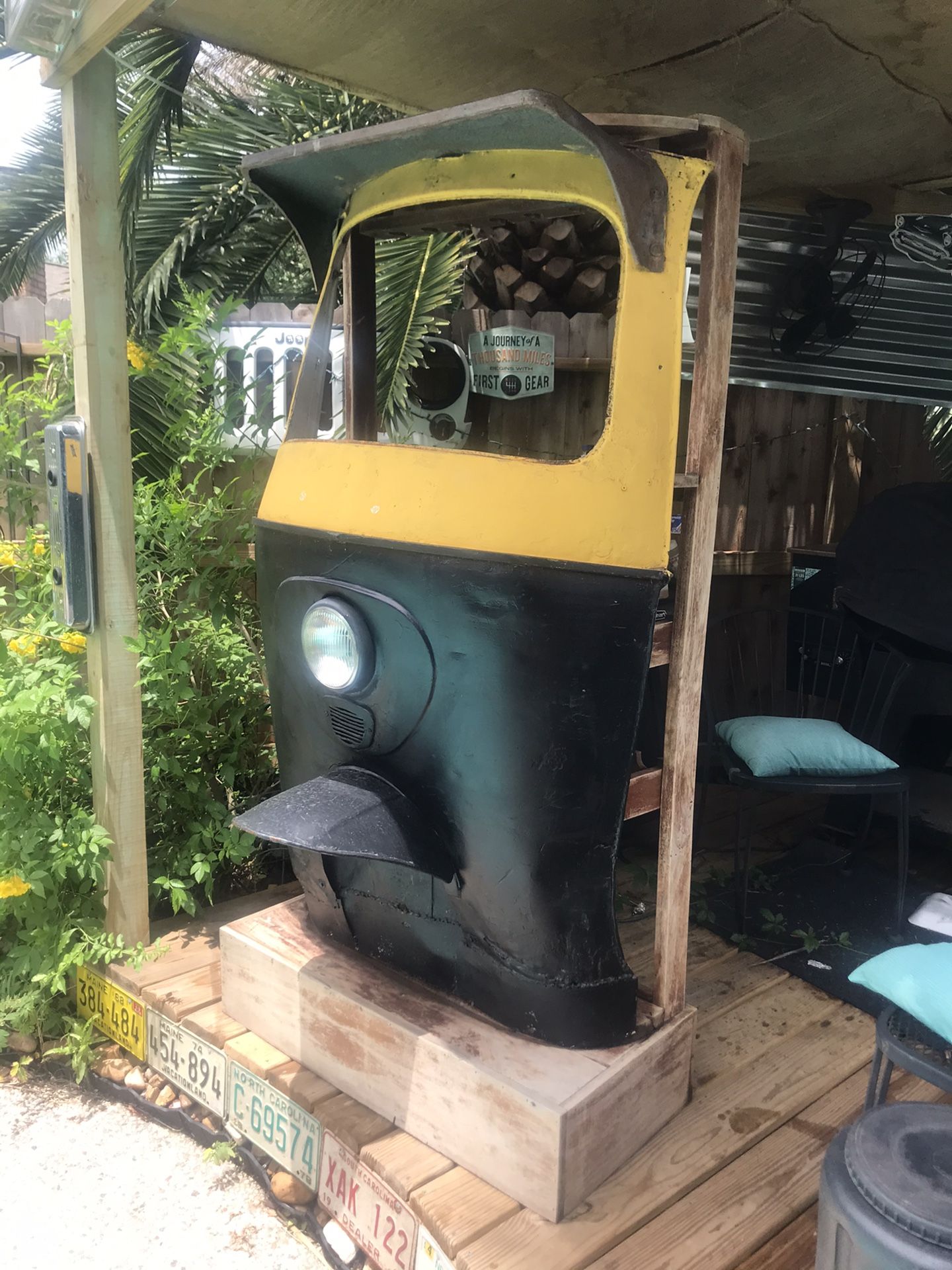 This is so cool! Got it from Greg Majors Auction a year ago. Old Cushman type Middle East delivery vehicle front end. Has glass holder up top and bottle holder below on the back side. Plug it in and the headlight comes on. Perfect for a man cave and what a great conversation starter!