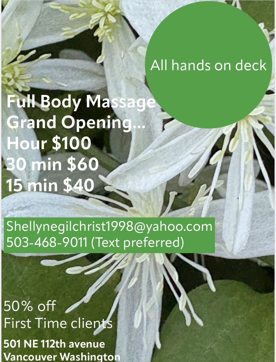 Come enjoy a comfy massage on a therapy massage bed with essentials oils. My grand open on money will have snack and beverages for my first time customers.