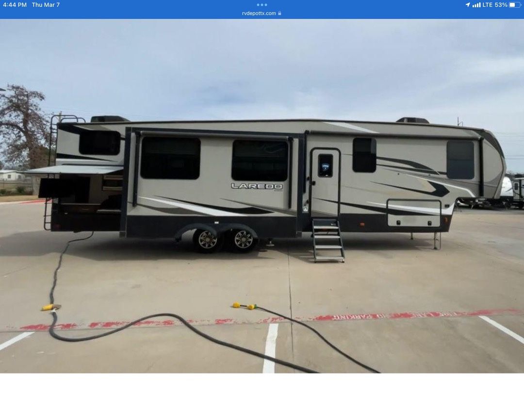 2022 keystone Laredo 40’ 4 slides I full bath and I half bath Everything works in A/C heaters Has washer dryer hook ups outside kitchen with TV Has two roll out awnings