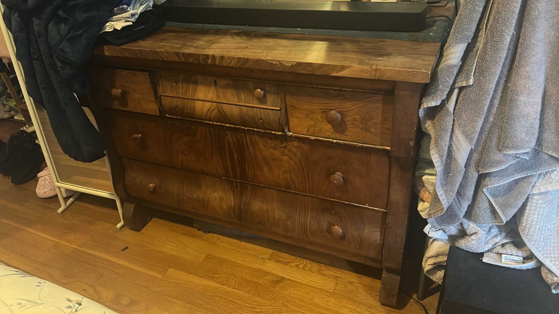 Solid wood dresser with a dark walnut finish and plenty of storage. Sturdy, heavy, and good quality. Missing knobs and bottom drawer has some trouble closing but is spacious. Pickup only.