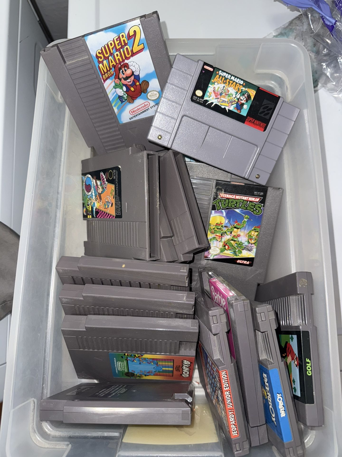 1 Super Nintendo 1 mortal combat 3 sega genesis and 16 Nintendo entertainment system (NES) games (all from my own home growing up) Buy the whole box for $140 Rare Deadstock Vintage