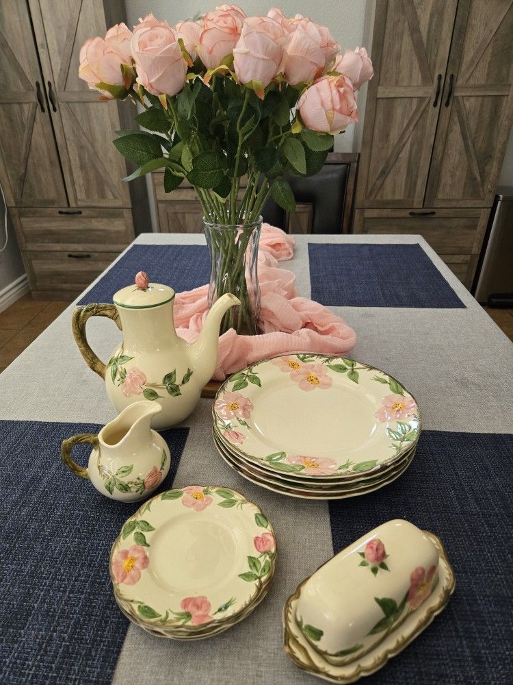 ✨️ Vintage Franciscan Desert Rose – 11-Piece Collection For the Elegant Collector or the Romantic Hostess $150 Call if interested (contact info removed) Step into timeless sophistication with this beautifully preserved 11-piece Franciscan Desert Rose collection—an American classic celebrated for its hand-painted blush-pink roses, soft green leaves, and cream-hued earthenware glow. Crafted with care and beloved for generations, this charming set includes: • 1 Teapot with lid– graceful and statement-worthy • 1 Milk/Creamer – delicate and sweet • 1 Covered Butter Dish – the perfect table accent • 4 Dinner Plates – ideal for intimate, garden-inspired dinners • 3 Pastry Plates – perfect for tea-time indulgence This heirloom pattern, famously selected by First Lady Jacqueline Kennedy for the White House, has long stood as a symbol of casual luxury and refined charm. All pieces are in excellent condition, ready to grace a new elegant home. Price: $150 Available for local pickup Let these timeless florals bloom again ✨️ Call for details or to schedule a viewing (contact info removed)
