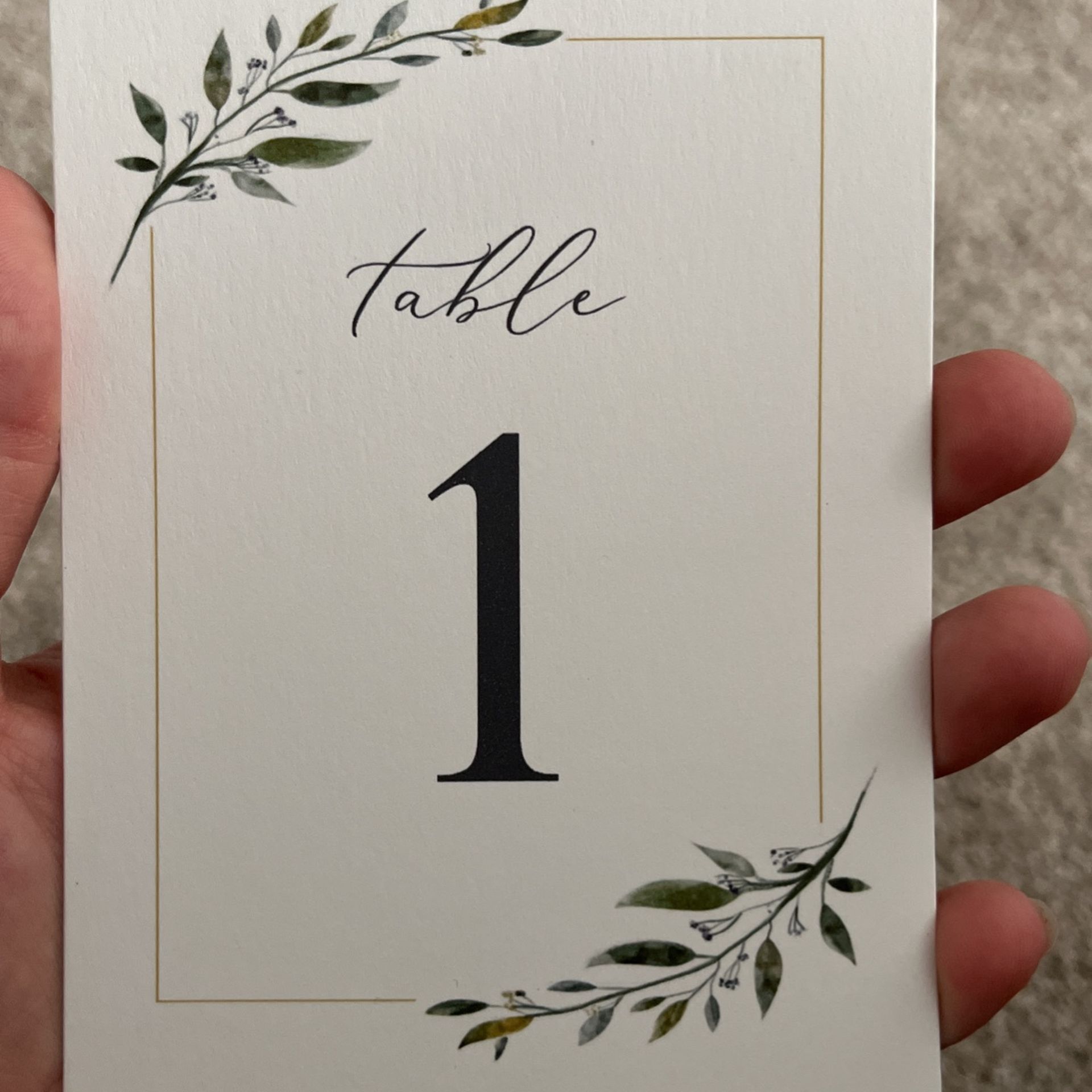 Tented table numbers/table markers, double sided (same printing on both sides), with greenery design, numbers 1-30. Used once, like new condition. Originally $40 via Etsy.