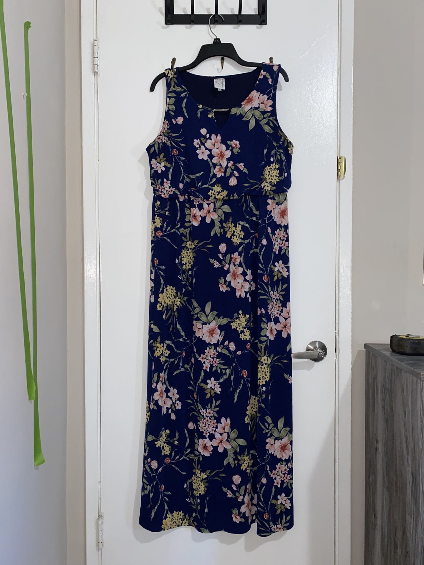 This navy blue floral print dress is like new. It’s in great condition. It’s a size Large. It’s 56 1/2 inches long and 16 1/2 inches around the waist. $10 This item is exactly as shown in the pictures. So please view all pictures. This item will be sold as is. I’m located in Covina. I don’t ship out any items. I don’t meet halfway.