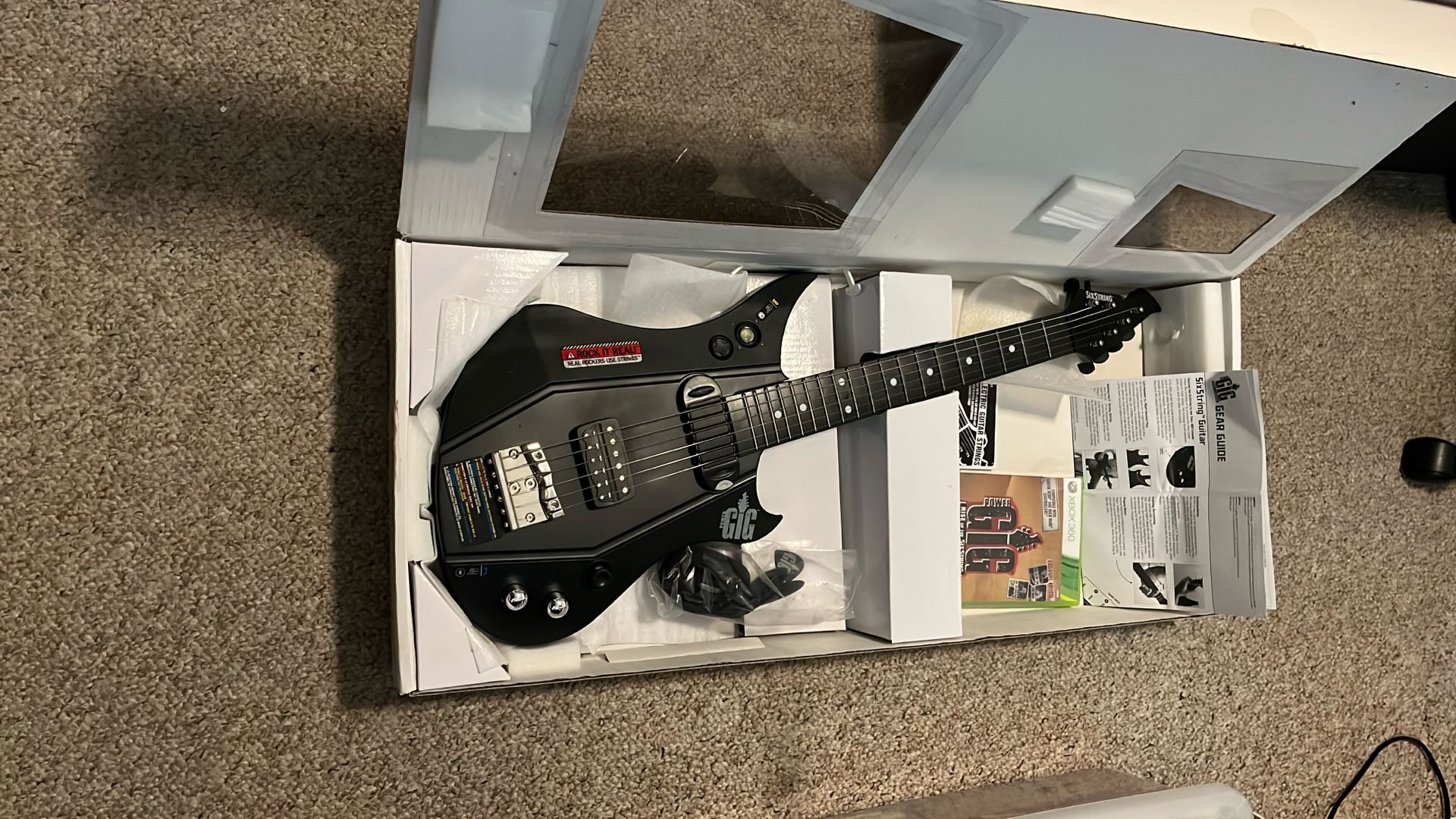 Syncs to an Xbox 360 as a controller Comes with: - Instructions - Rise of the SixString game - Guitar pick - Extra strings - Strap Never used